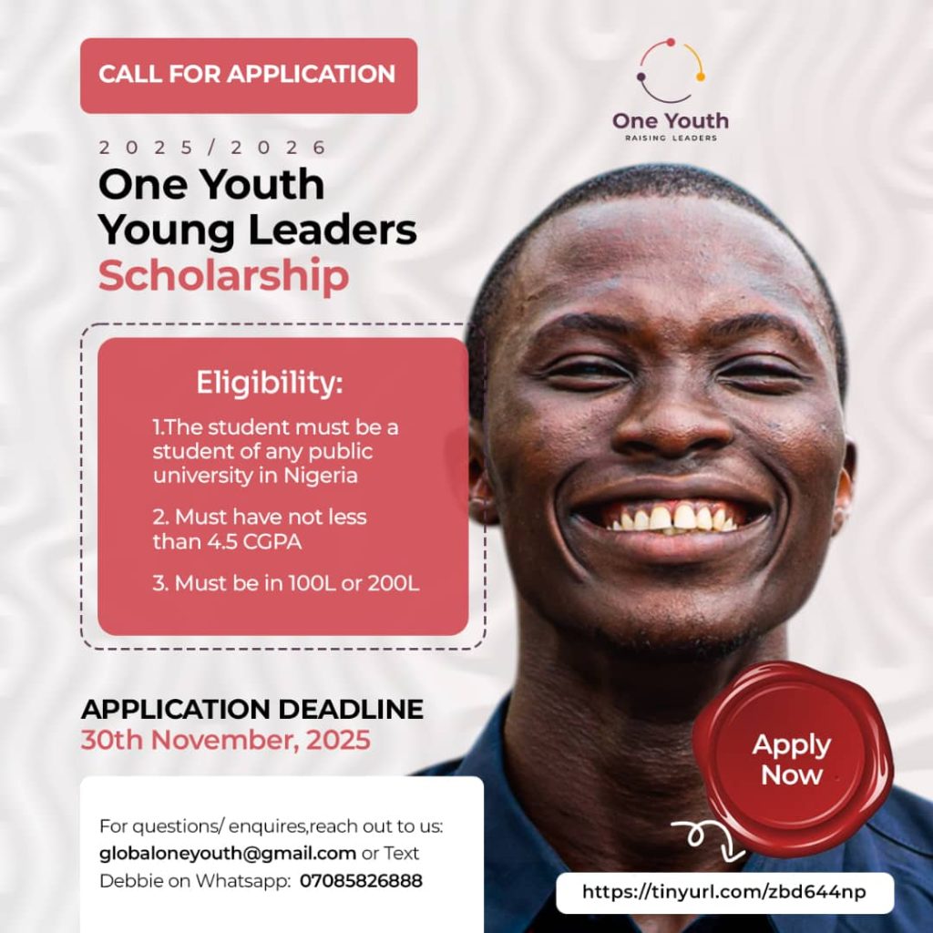 The One Youth organization has announced the commencement of applications for its 2025/2026 Young Leaders Scholarship, a program aimed at supporting exceptional students in Nigeria’s public universities.